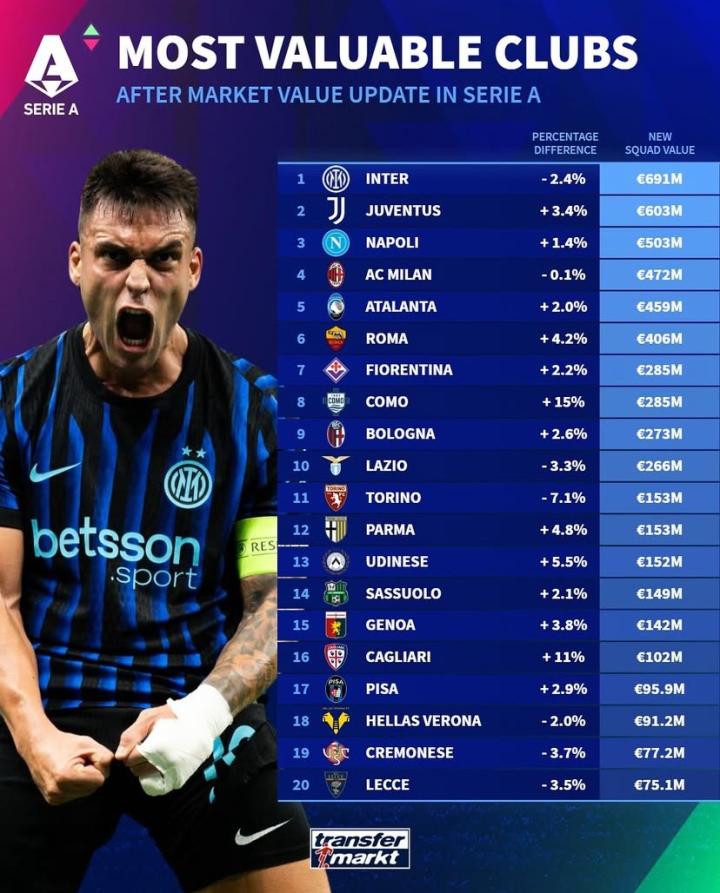北京时间10月7日,在更新了意甲球员的市场价值后,德转还公布了此次更新后意甲各俱乐部总身价的变动情况以及具体排名,国际米兰以6.91亿欧元位居榜首,紧随其后的是尤文图斯、那不勒斯以及AC米兰。